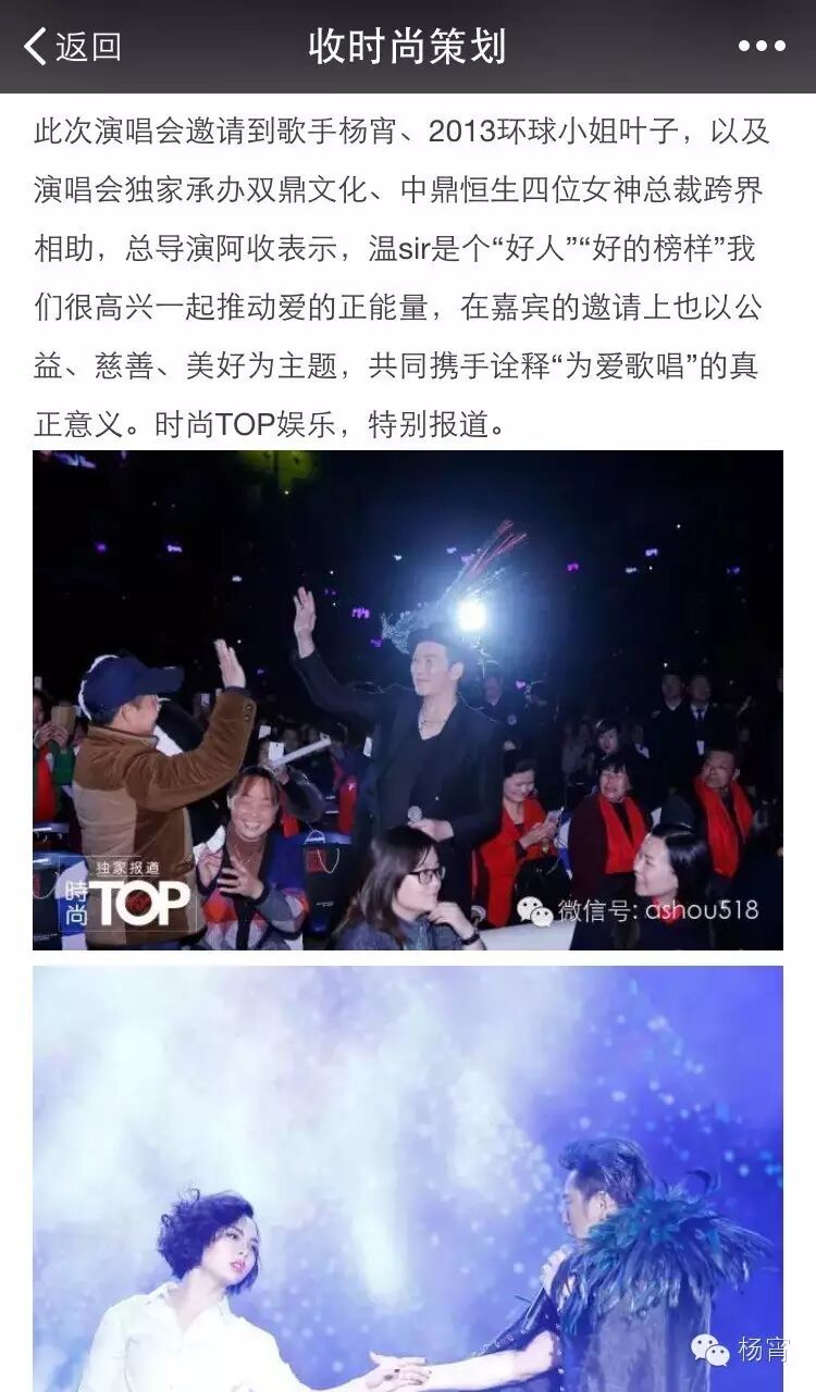此次演唱会邀请到歌手杨宵、2013环球小姐叶子,以及演唱会独家承办双鼎文化、中鼎恒生四位女神总裁跨界相助,总导演阿收表示,温sir是个“好人”“好的榜样”我们很高兴一起推动爱的正能量,在嘉宾的邀请上也以公益、慈善、美好为主题,共同携手诠释“为爱歌唱”的真正意义。时尚TOP娱乐,特别报道 新联链接: http://mp.weixin.qq.com/s?__biz=MjM5NDQ4ODI1Mg==&mid=402671626&idx=1&sn=763c3767c372b6ec6ad3c7b27633b93f&scene=2&srcid=0313Uwx8wjTPb5r3DeohpOeO&from=timeline&isappinstalled=0#wechat_redirect