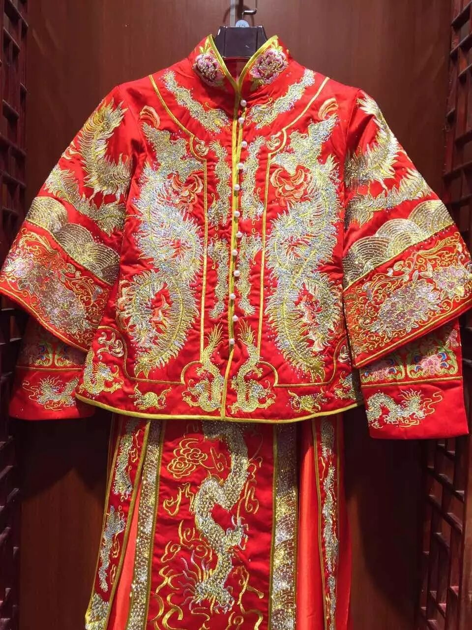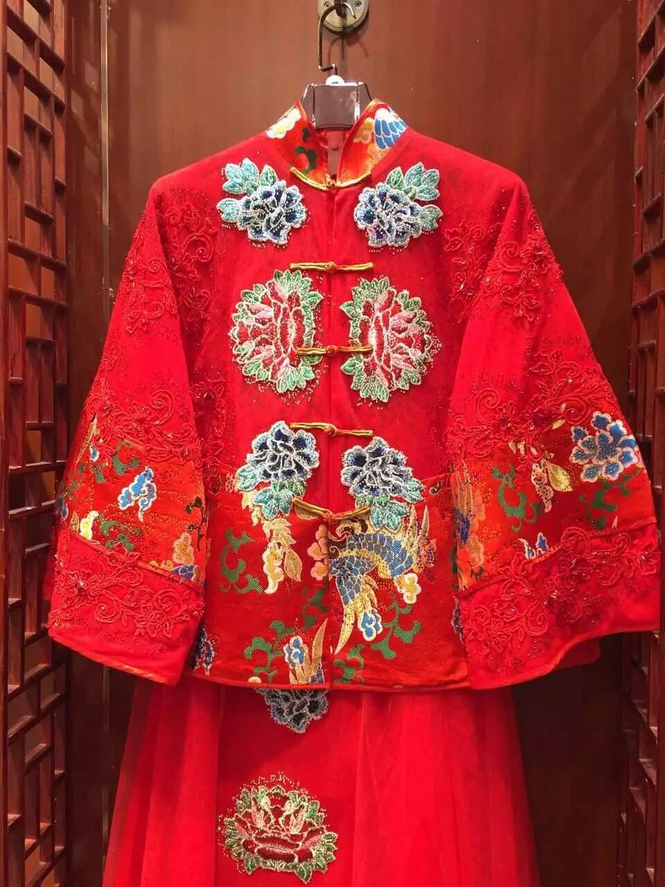 秀禾服又分斜襟和对襟,整体设计以宽松为主,可以恰到好处的烘托出新娘的温柔贤淑。如果在婚礼上新娘穿秀禾服,新郎最好以改良中山装搭配,既不会像西装一样有违和感,又不似穿长衫马褂般夸张。相近的暗花和刺绣,和新娘的秀禾服绝对“天生一对”。