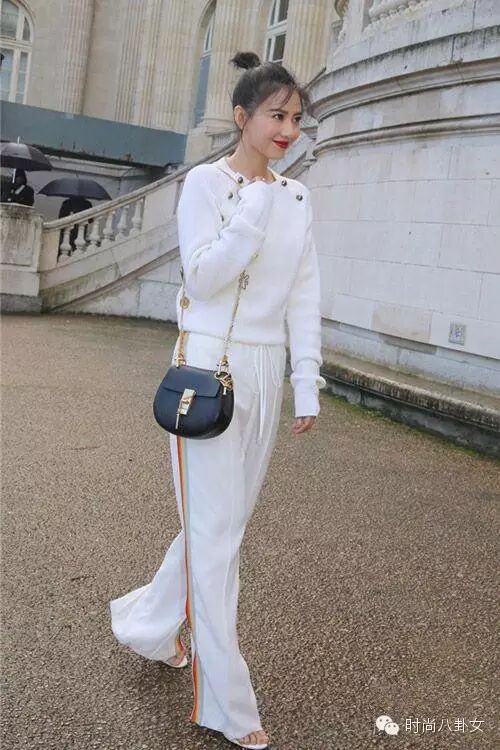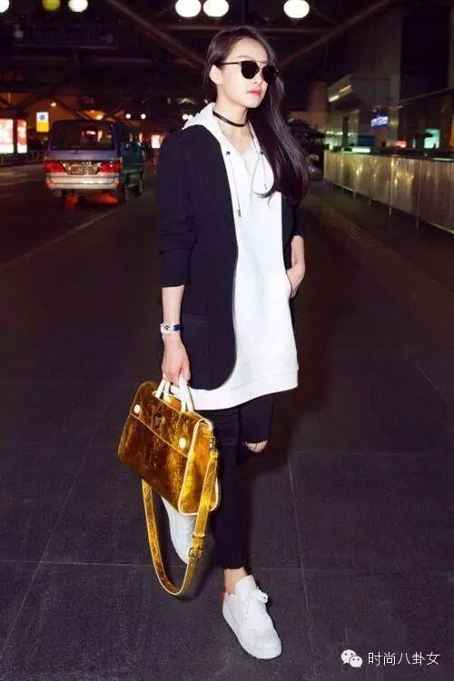 宋茜用dior小西装配白色连帽卫衣和紧身裤、小白鞋,韩系十足,金色包包闪耀夺目,成为暗夜里的亮点。