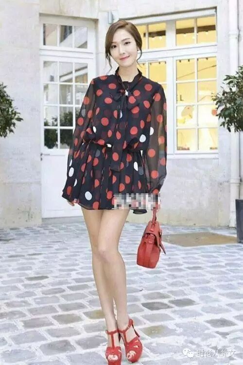 郑秀妍第三套look,波点雪纺连衣裙配红色高跟鞋大秀长腿,性感又妩媚。韩国女星和中国女星的看秀造型比起来,气场始终差了点。↑↑↑