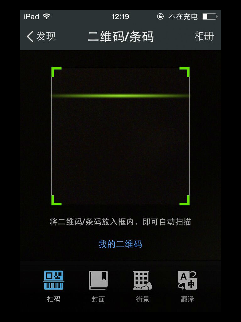 2、进入微信“扫一扫”功能,点击右上角“相册”即可,如图: