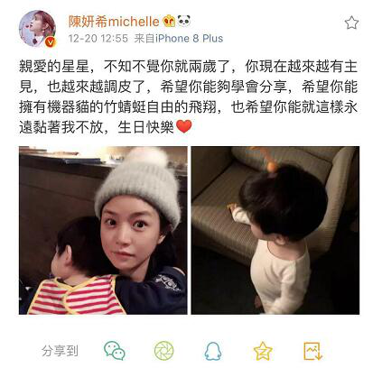 像陈妍希家的儿子“小星星”就在这么一个充满父母关爱和保护的环境下茁壮成长的,早年孩子刚出生的时候陈妍希很少放“小星星”露脸的照片,即使是两岁生日这样日子也只给大家看宝宝的侧颜,可谓是“全方位的保护”了!