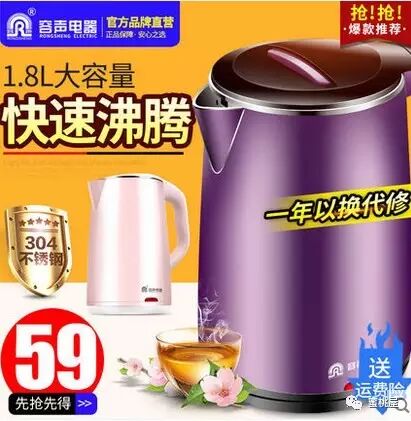 推荐语:天猫商家销售,领取10元券后,价格49元。1.8升大容量,保温更温润;采用304食品级不锈钢,拒绝高锰钢,饮水健康放心;双层防烫,壶体不烫手,中层隔热层,防止热量流失,外层耐高温烤漆材质;大角度开盖,加水轻松方便;立体控温,自动断电,拒绝半生水,安全放心。