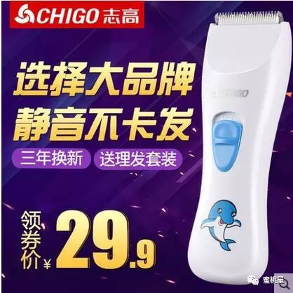 推荐语:天猫商家销售,领取20元券后,价格29.9元。采用婴童专用安全刀头,倒圆角处理,不伤宝宝皮肤;安全USB充电,减少99.9%漏电危险;进口优质硅胶密封防水,可在水下连续浸泡24小时;低噪马达,静音体验,宝宝睡觉不会被吵醒。