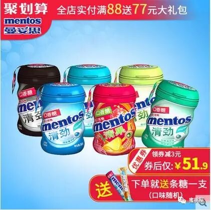 推荐语:天猫旗舰店销售,领取10元券后,价格44.9元。曼妥思的这组口香糖含有酸柠红果、特强薄荷、经典薄荷、冬青薄荷、青柠薄荷、清香薄荷六种不同的口感。小编最中意的一款,强烈安利。