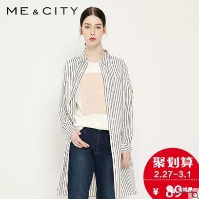 推荐语:天猫mecity官方旗舰店聚划算89元,尺码齐全,MECITY女士长款条纹长袖衬衫。雪纺的面料,保证舒适的质感,小翻领设计,很显气质。修身版型,简约的黑条竖纹,很有设计感。
