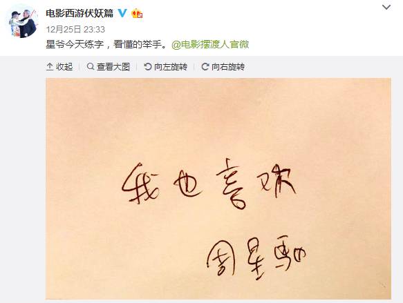王家卫这一条微博引来了圈内明星们的热情转发,甚至“惊动”了一向与贵圈纷争保持距离的周星驰力挺,没有微博的星爷用手写的方式写下了“我也喜欢”,由新片《西游伏妖篇》官微发出,支持王家卫监制的《摆渡人》。两个香港巨蟹座大神导演的惺惺相惜一时间也令吃瓜群众十分兴奋,不少网友跑到《西游伏妖篇》官微下借机向周星驰表白:“我也喜欢周星驰”。