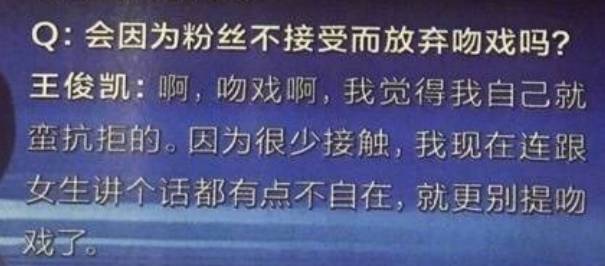 对拍吻戏的回答倒是很让粉丝放心。他和女生说话都不自在,又怎么会急着拍吻戏呢?