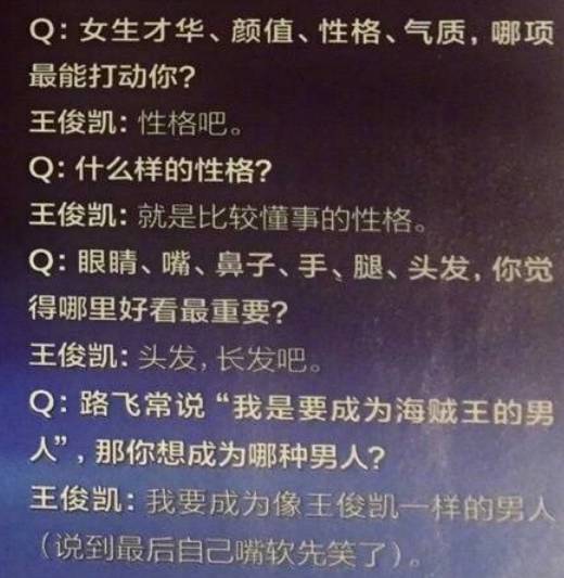 总的来说,他想成为王俊凯一样的男人,他想拥有一个懂事、长发的女朋友。迷妹们赶紧对号入座了,说不定就是你!