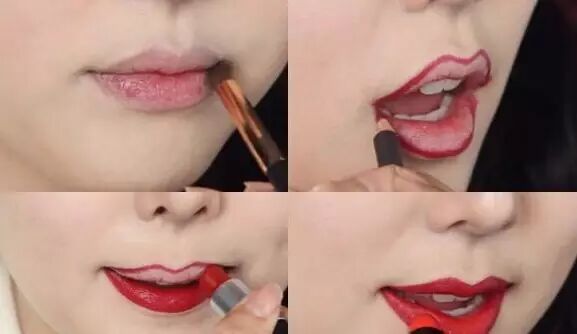 用同色的唇线笔勾勒出嘴唇形状,然后用大红色涂满;