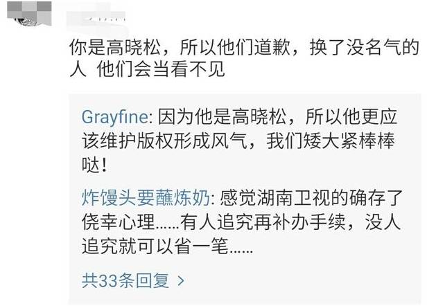 评论中也有网友一语道破真相,因为高晓松所以湖南卫视很快道歉,要是没名气的估计就当看不见了。