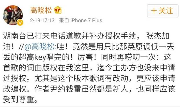 不过,唱火了也惹来了麻烦。这不著名音乐人高晓松来讨版权费了,先对张杰也是夸了一番,然后才提到版权的问题,并说作者虽然是新人但也应该受到尊重。