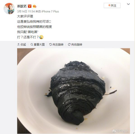 袁弘并没有生气,反而转头在家为她做了个纯黑色的可颂,吐槽她皮肤黑,让她“黑吃黑”吧。