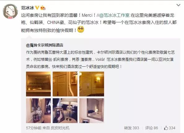 “这间套房让我有回到家的温馨!Merci!”稍后,范冰冰转发该微博并回复道,Merci是法语谢谢的意思。