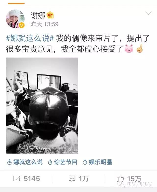 3月24日下午,谢娜发博称偶像为自己审片(娜就这么说),提了很多宝贵的意见,她都虚心接受了。