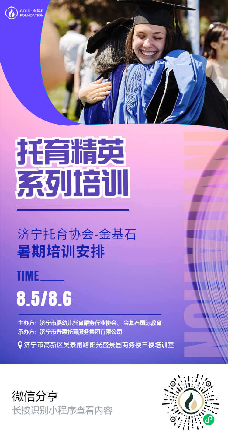 2023年8月5日,济宁市婴幼儿托育服务行业协会将携手金基石国际教育有限公司对0-3托育机构的教师进行培训,进一步提升教师在0-3岁婴幼儿早期教育服务领域的专业能力,打造优秀且专业性强的托育教师队伍,为家庭及婴幼儿提供高质量的托育服务。