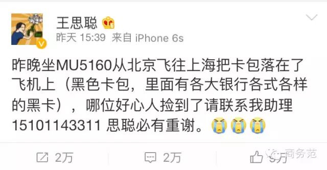 思聪老爹王健林刚坐会首富宝座,思聪就在坐飞机的时候把卡包丢了。十万火急的思聪跑到微博上发了寻物启事求助(颇有些病急乱投医的意味,连助理电话都暴露了。。。。。)。