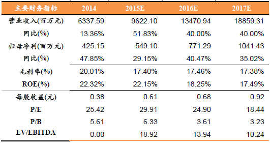 不考虑转增影响,我们预计公司15-17年摊薄EPS为0.61、0.68、0.92元,当前股价对应30、25、18倍PE。考虑公司龙头业绩高增长可持续,后续平台战略带来业绩与估值提升,维持“强烈推荐”评级。