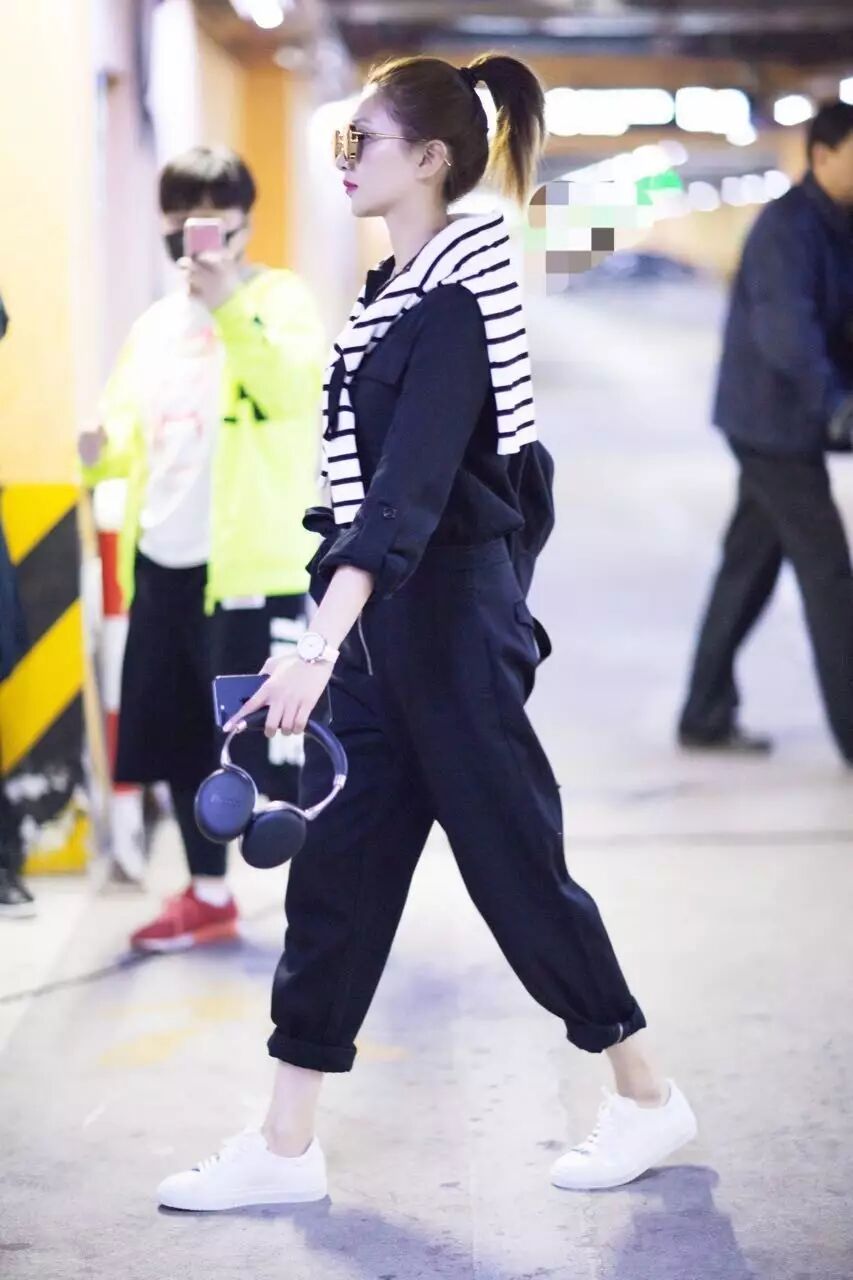 江疏影的连体裤偏海军风格,条纹衬衫巧妙地点缀,打破一片深蓝的单调,腰间绑带和圆形拉链都是一些小心思。