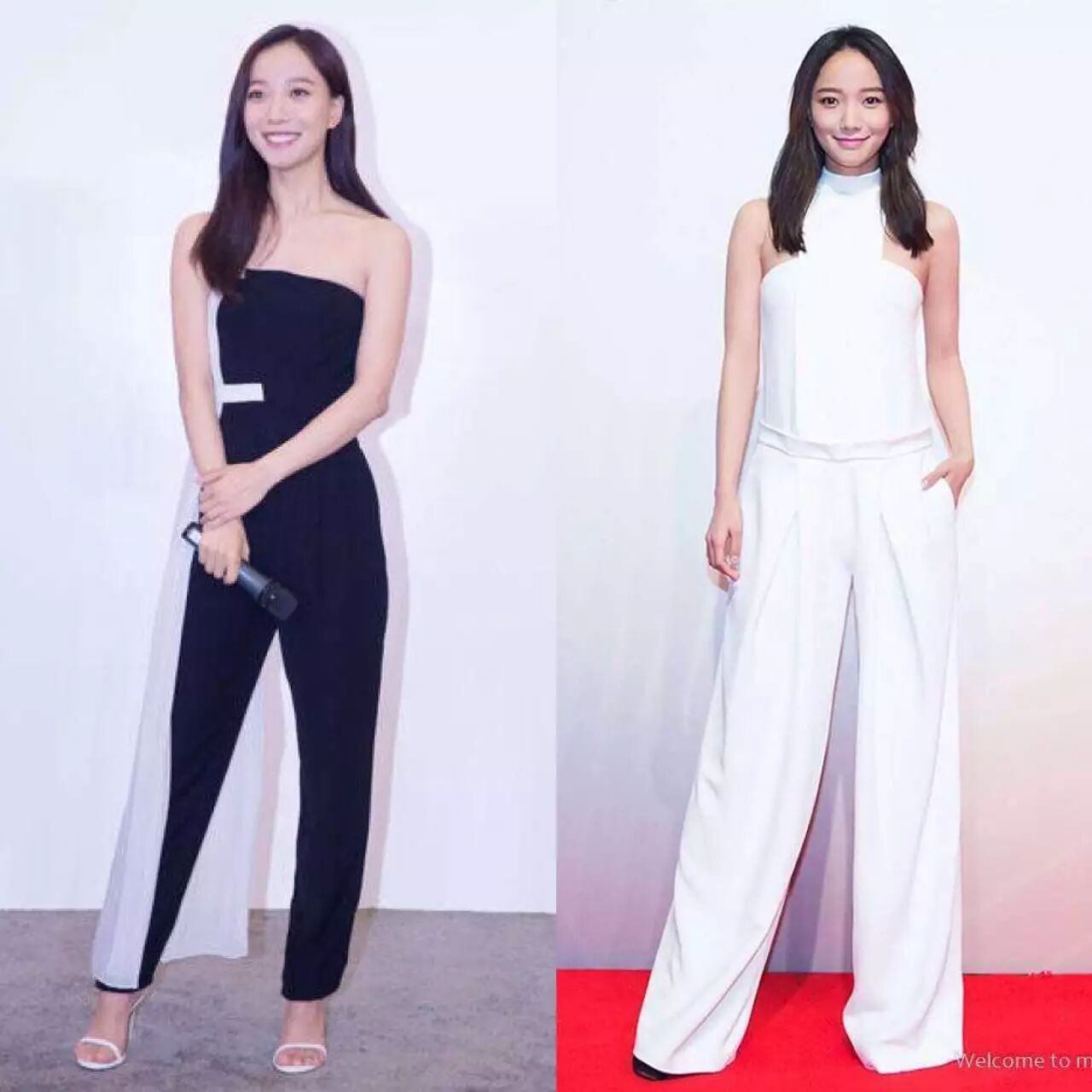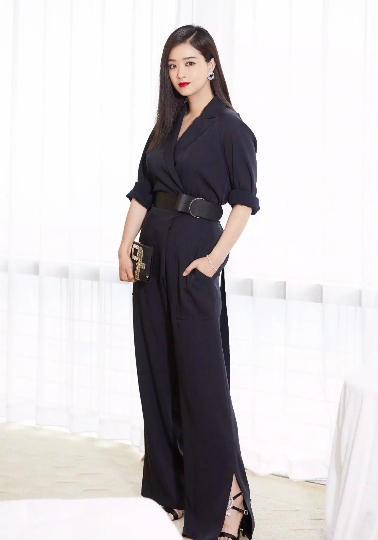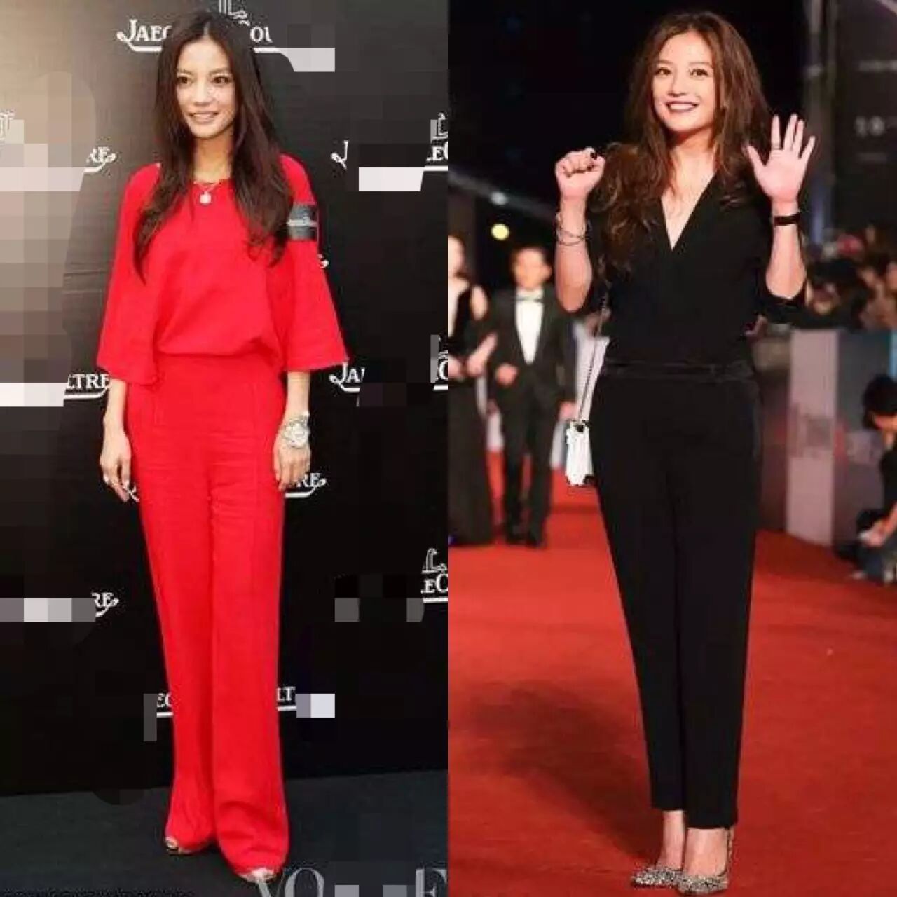 赵薇这两身同样是连体裤,但左图显得更游刃有余。因为左图的腰线比右图高,她的上腰比下腰细,所以红色的阔腿裤比黑色的哈伦裤型遮肉。