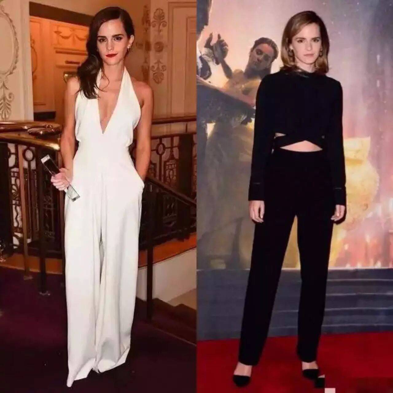 艾玛·沃特森穿上黑\白经典连体裤同样成熟了不少,右图交叉绑带小露蛮腰,干练和性感共存。