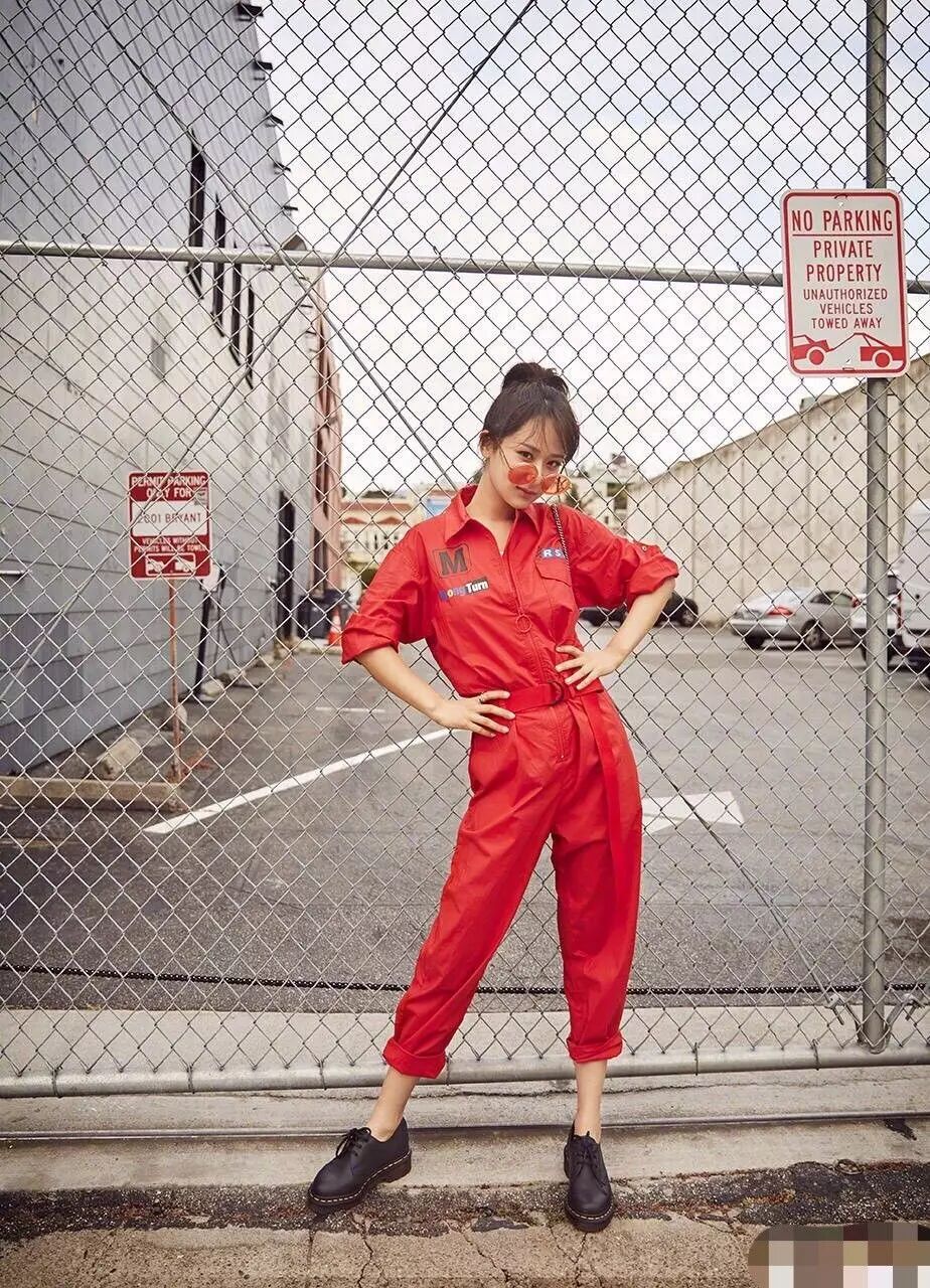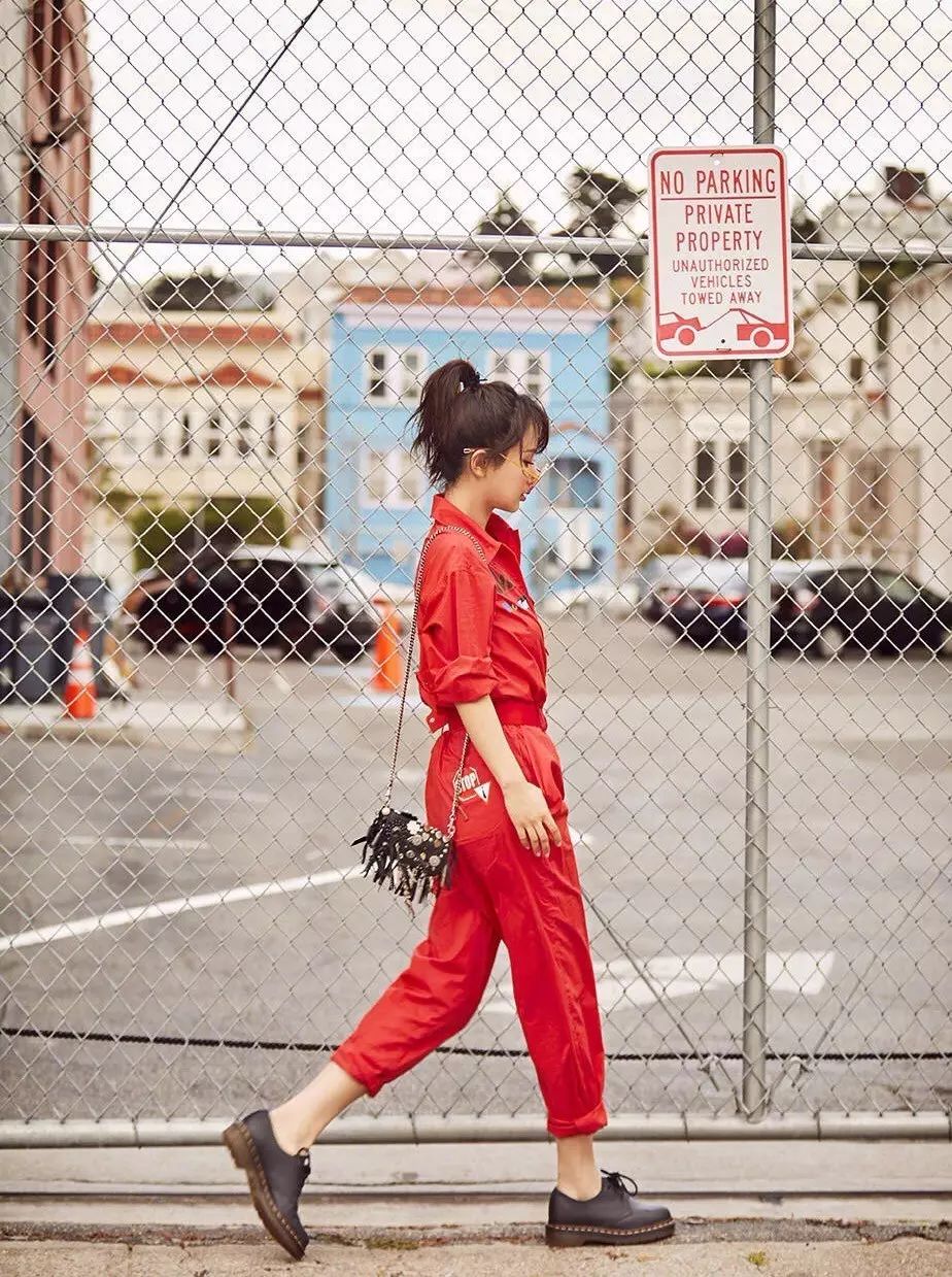 杨紫这套红色的连体裤,难度挺大,一不小心就变成消防员。