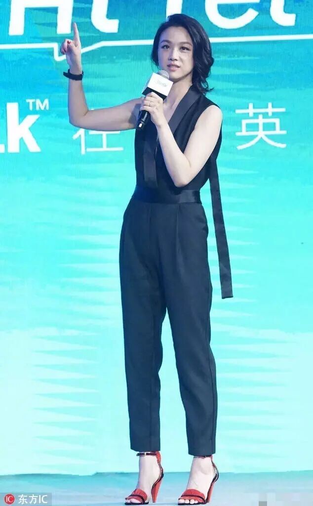 因为汤唯的身材属于腰长,腿不长的类型。这身连体裤修饰腰身,改善比例,还能修饰腿型,深V和无袖的设计露出较瘦的部位,产后的身材状态看着相当不错。