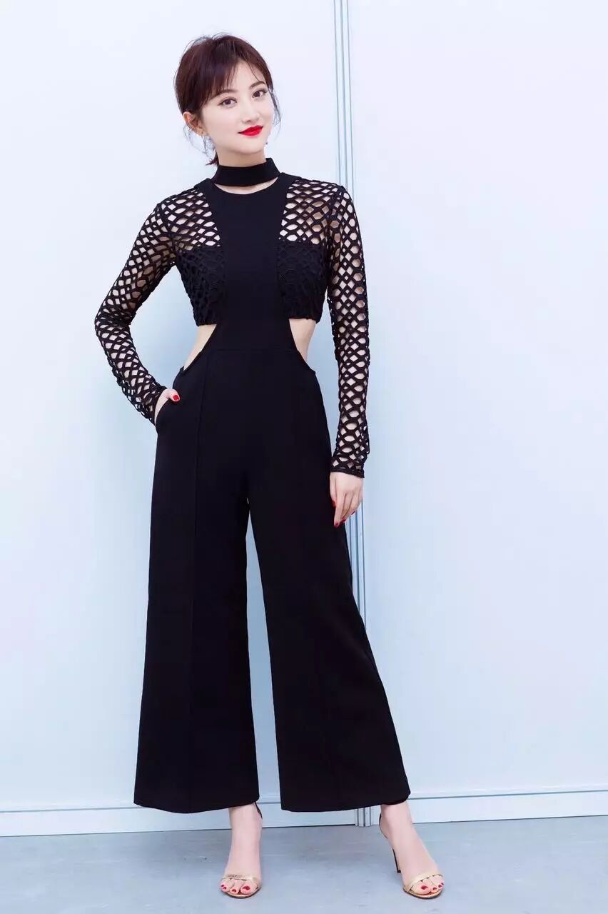 景甜长着一张人如其名的脸,心形脸+大眼睛+白皮肤,标准甜妞一枚。要化身有气场的御姐范,靠一身帅气的连体裤就能完成。网状的袖子很独特。