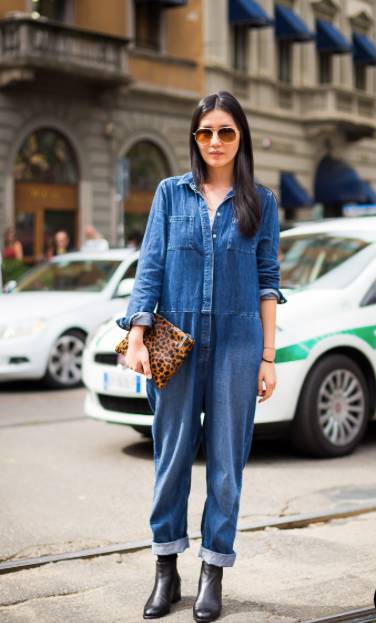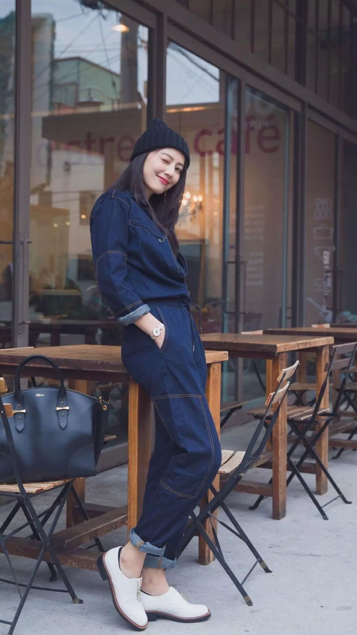 工装连体裤的特点是够宽大,有着中性化的帅气。最大的问题是款式偏单一,主要是都丹宁材质,深蓝的配色,很容易就同质化,要穿的与众不同考验功夫。