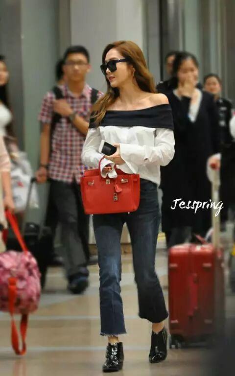 ▲ 一字肩衫衬搭九分喇叭牛仔裤,性感锁骨,气质迷人