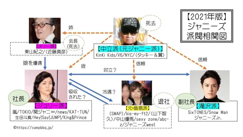 在Johnny喜多川还没有去世的时候藤岛景子和知名经纪人饭岛三智的在社长继承问题上的竞争关系就呈现了白热化的趋势,最终饭岛三智退社。