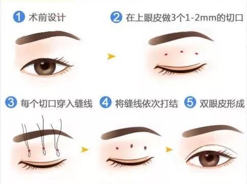 只在上眼睑皮肤处做2-3个1毫米的微小切口,只在上睑两端各开一个小孔式切口切开眼睑皮肤,去掉部分脂肪,将真皮层与睑板进行三点缝合形成重睑线。抽取脂肪、拉紧皮肤后,能形成自然双眼皮。因切口的不同,有三点、多点等可选。