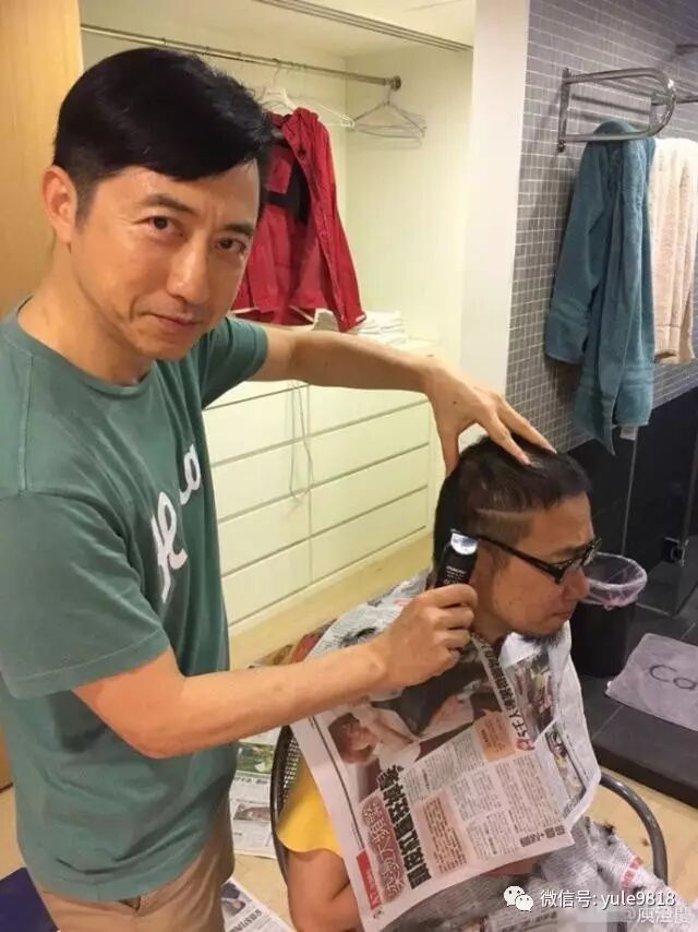 照片中庾澄庆身着短T变身理发师,手里正拿着理发器准备给自己口中的第一位“顾客”剃发,而“顾客”脖子上套着充当理发围布的美发报纸真是既抢眼又应景。