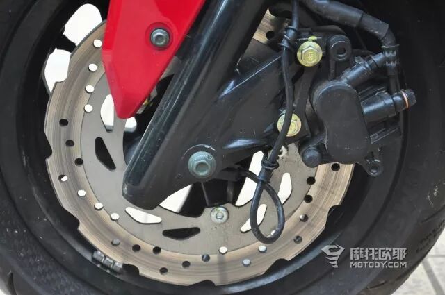 制动方面采用前单向双活塞卡钳配267mm刹车碟,后单活塞带卡钳配220mm刹车碟。遗憾的是目前并没有装配ABS的版本。