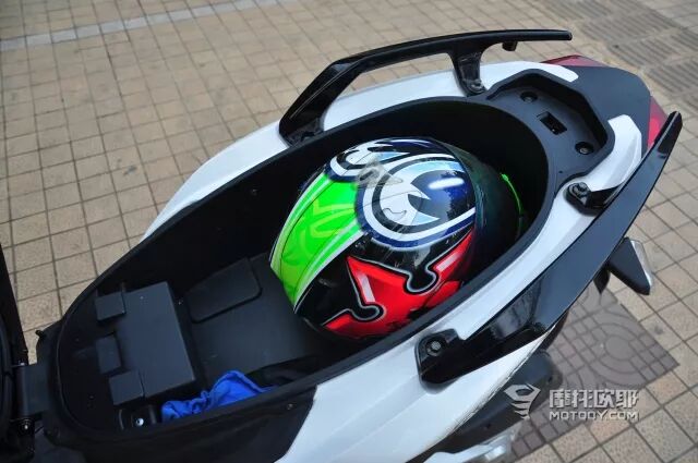 储物空间表现较为理想,座桶内可放置一顶全覆盖式头盔并且还有一些额外空间。