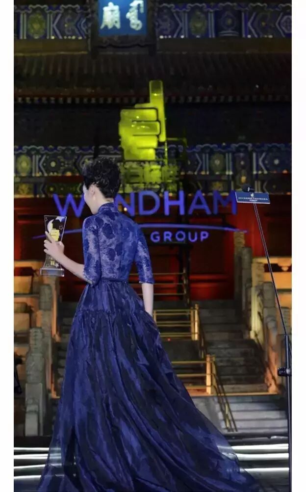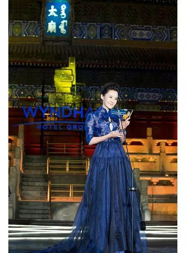 一袭深蓝色蕾丝包纱曳地礼服优雅性感,裙摆飘逸如流动的大海。女性的温婉融合海纳百川的气魄,仿佛置身深海的冰雪女王,绝世而独立。