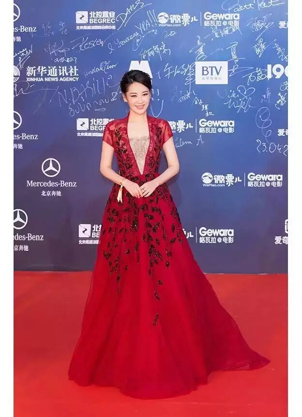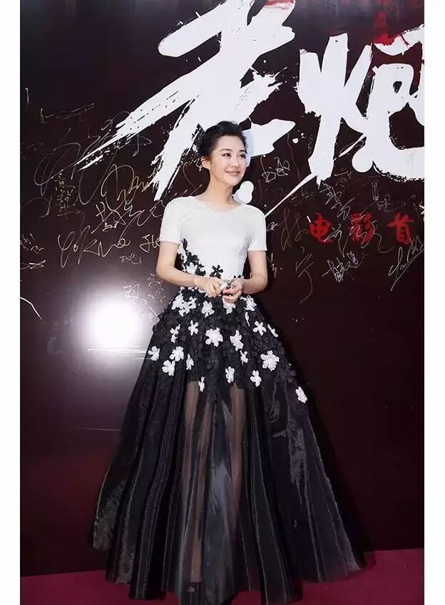 黑色薄纱曳地长裙,周身遍布刺绣花朵。高贵不失性感,还夹带着一点粉红系的少女气,人花相映,别有风情。