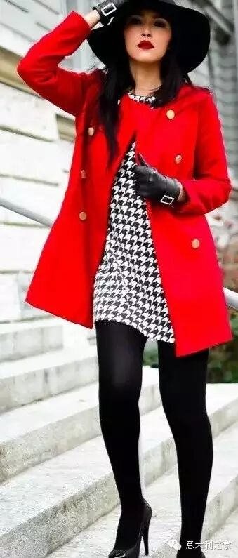 红与黑是永远的经典,搭配黑白千鸟格图案,不死板不单调,更显娇俏活力。