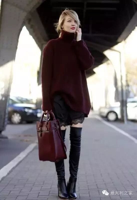 酒红色连衣裙,女人味十足。酒红色毛呢帽与酒红色皮衣相搭配霸气十足,轻易就能穿出女王范儿。