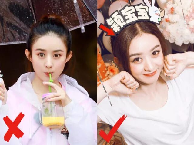 看赵丽颖美美的样子,眼睛又圆又大的女生不妨跟她学一学,因为眼睛本身够大,所以眼尾处没必要过多延长,在眼尾处微微向上提即可。