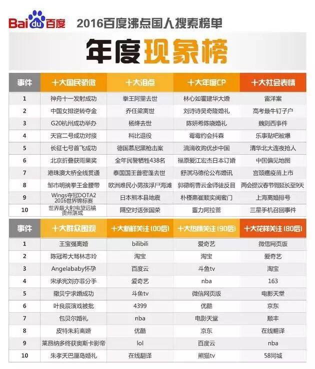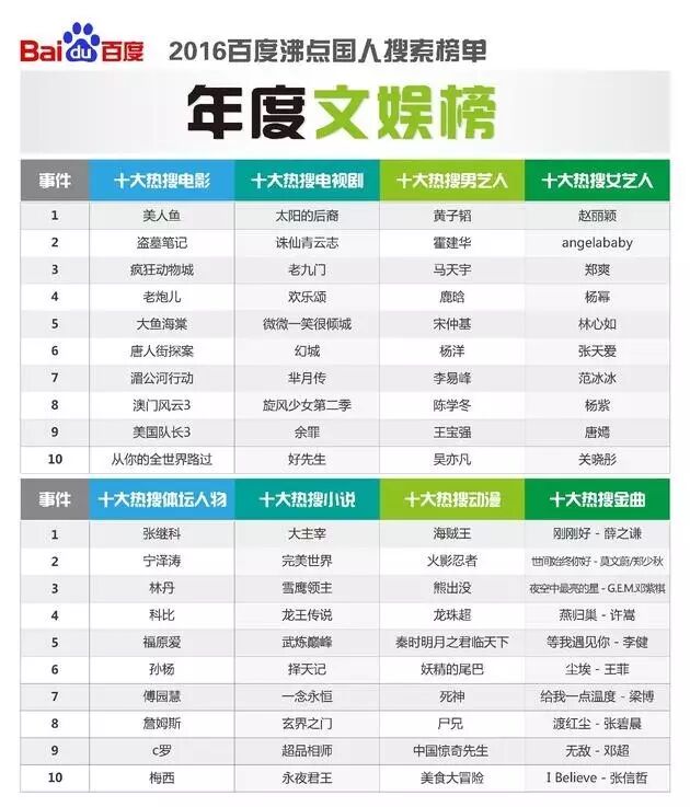 2016年文娱榜单中,《美人鱼》(mermaid)和《太阳的后裔》(Descendants of the Sun)分别位于影视榜单之首,《大主宰》(Dominator)和《海贼王》(One Piece)在文艺圈内获得满满的人气,成为年度最受关注的小说和动漫。娱乐圈中,黄子稻、霍建华、赵丽颖和Angelababy荣登热搜人气王的宝座,分别位于最受关注的十大男女艺人冠亚军。