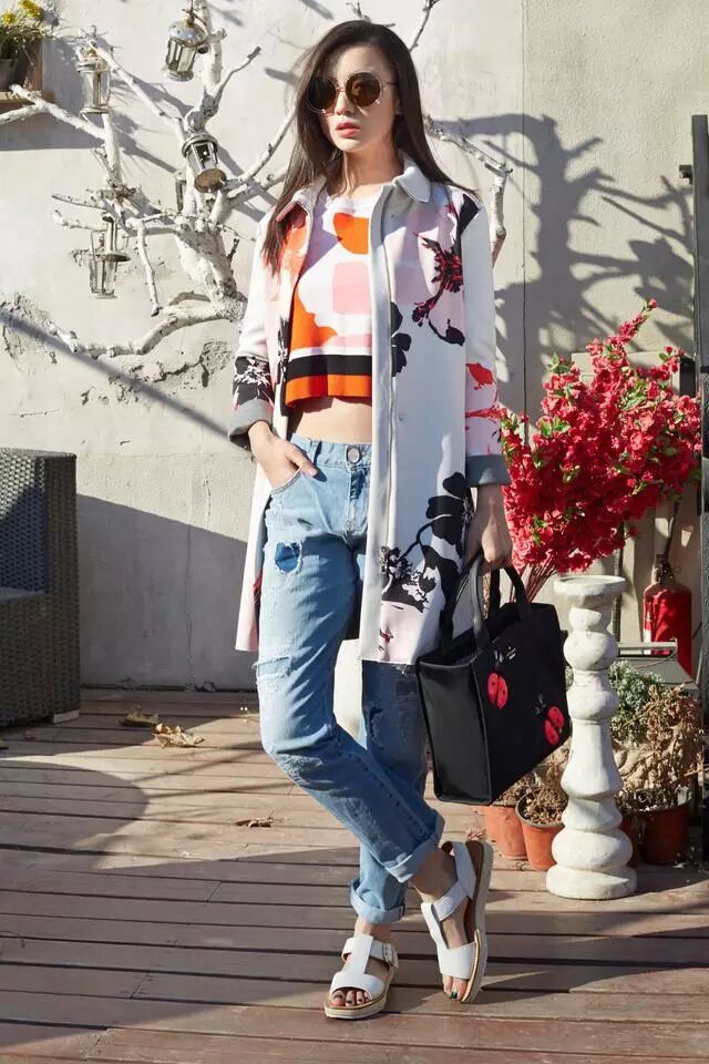 印花短上衣搭配印花长款外套,穿在她身上,没有复杂的感觉,反而觉得很时尚。