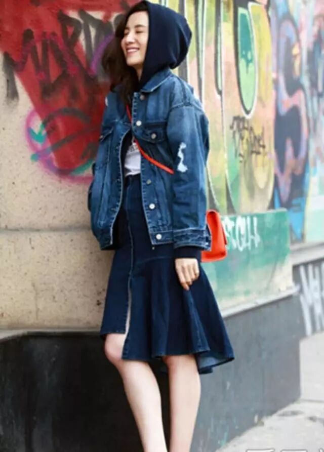 就敢把绿裙子穿身上,搭配牛仔上衣,非常时尚。