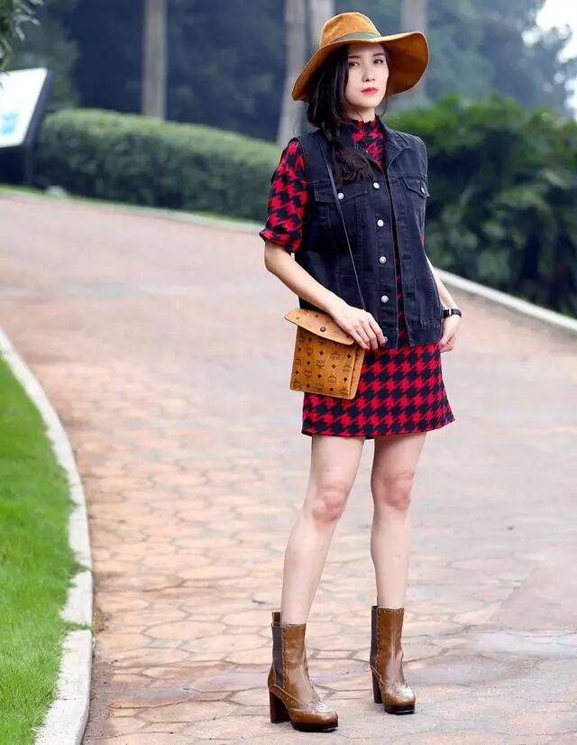 红色的印花连衣裙搭配马甲外套,一双马丁靴,潮流又复古。