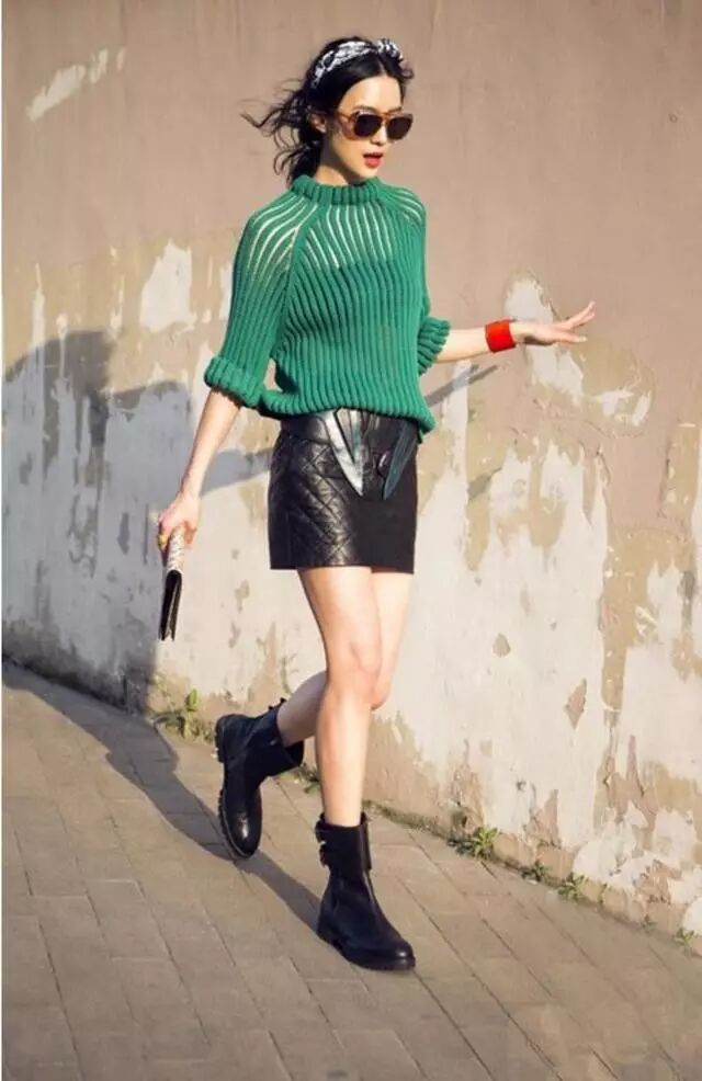 绿色镂空上衣搭配皮裙,好潮好有范!