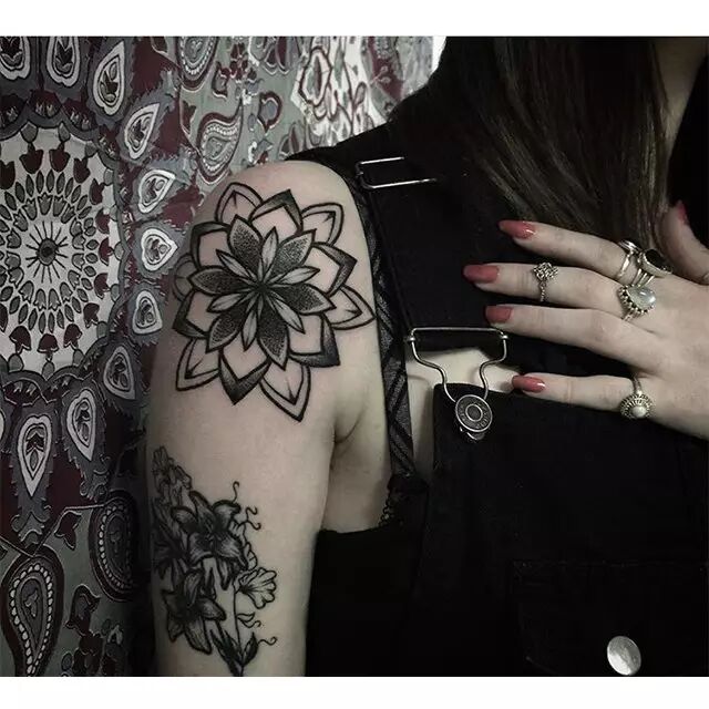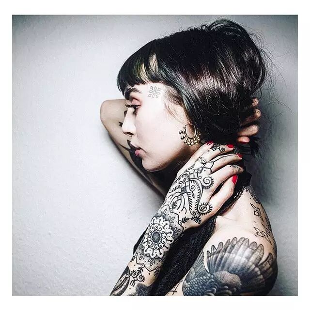 热爱纹身的她,更是把自己全身武装。零零碎碎的可爱小图案布满全身,纹身以黑灰为主,很多都是简单的Dot Work风格、mandala图案。她设计的图案亦然。