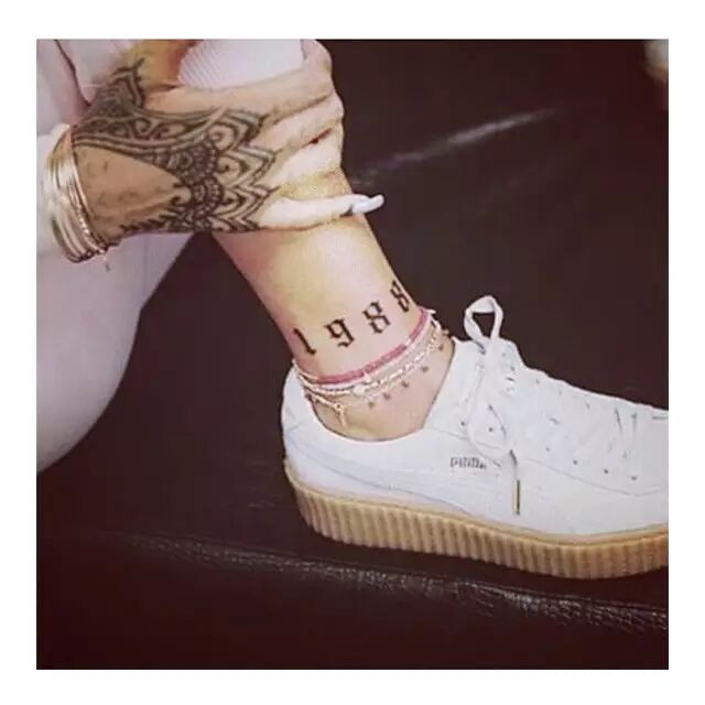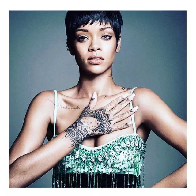 在最新的Vogue大片中,Riri更是一口气展示了5处来自McCurdy的文身。Riri身上那些人人效仿的纹身设计,包括胸前的翅膀、肋骨上的枪、右手食指上的Shhh和脚踝上的出生年份1988同样是来自Bang Bang!