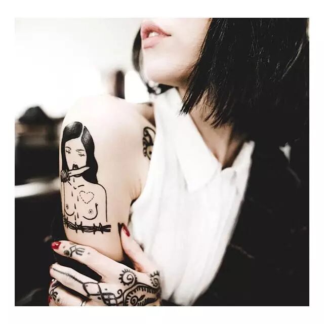 NINI的纹身设计就像漫画一样,多见人物图案,放佛每个小人都有自己的故事。但在这种可爱的图案中,又带有一丝暗黑气质在,十分有趣特别。