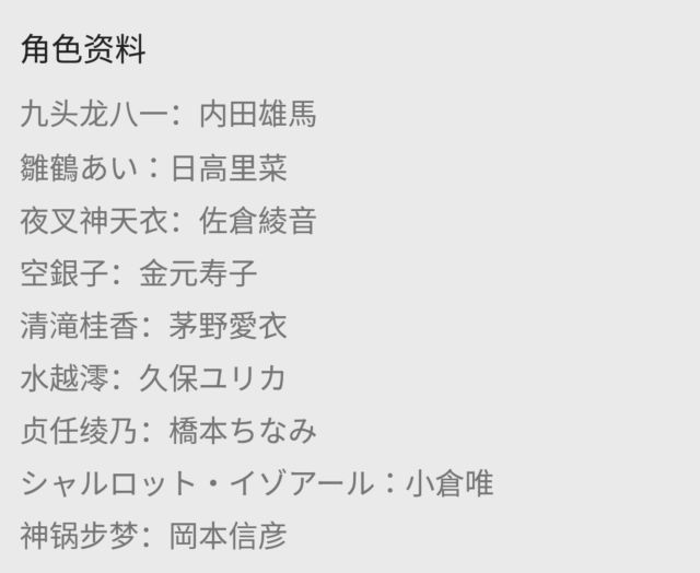 怎么样是不是感觉很良心?一排下来全都是大牌声优,什么茅野爱衣、佐仓绫音、小仓唯、冈本信彦,还有久保由利香、金元寿子、日高里菜、内田雄马等,就凭这声优我都要给制作组一个大大的好评(ノ゚▽゚)ノ