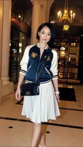 棒球衫搭配白色百褶裙,脚踩白色高跟鞋,很性感时尚。